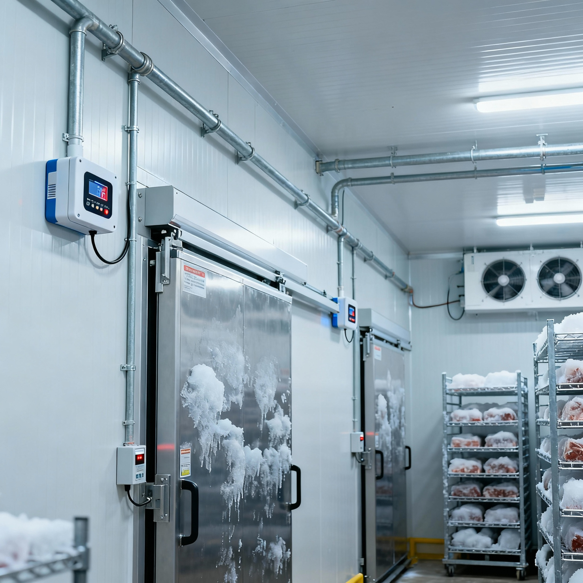 Для повышения безопасности и контроля технологических процессов на складах применяется интернет-контроллер DSU40ER, подключенный к герконам на дверях морозильных камер и холодильных помещений. Контроллер фиксирует открытие дверей и выдает предупреждения о занятости помещений, что позволяет оперативно контролировать процессы загрузки, выгрузки и предотвращать утечку холодного воздуха.